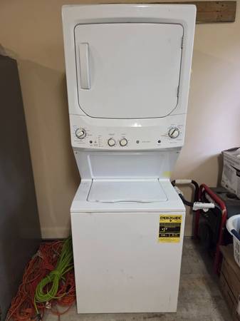 GE washer/dryer combo: GE Stacked Laundry Center with 3.2-cu ft Top load Washer and Electric 5.9-cu ft Dryer. Model Number: GUD27ESSJ1WW. Only used for two years, good condition. Priced reduced to $390 (was $600). If interested, please call show contact info