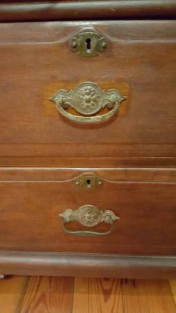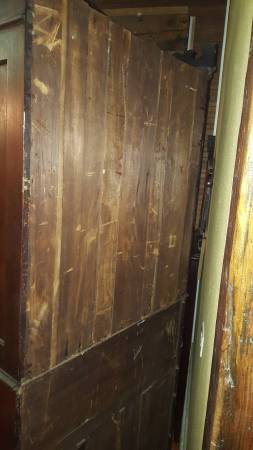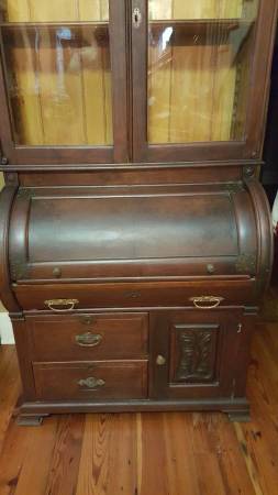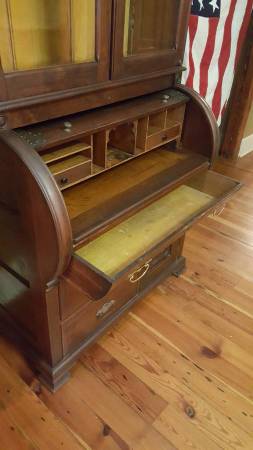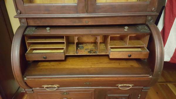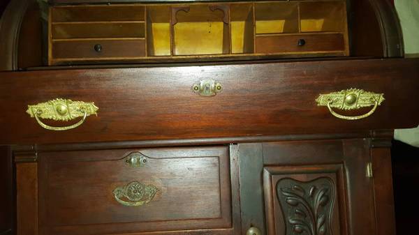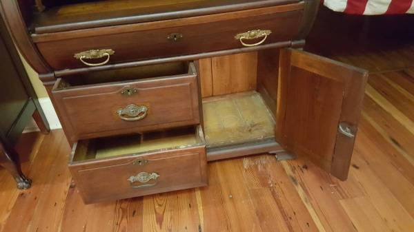 The photos show that the piece is very attractive and the crafted carving is both eye-catching and distinctive. This is a unique and lovely plantation piece from "back in the day." The open rolltop reveals a warren of compartments and 2 drawers. There is a main drawer beneath that spanning the width of the piece and 2 smaller drawers below. There is also a lower cabinet with door and space. This is a splendid desk from a local plantation.