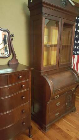 This old plantation statement piece is a 7-foot tall, well-crafted mahogany bookcase-secretary desk with lovely carved accents, amazing details with a metal accented "barrel-rolltop" desk cover feature and hand carved capitals surrounding the top and 2 sides. The construction is very solid, the carving striking and the piece original. Crafted around 1870-80, it would be the top feature in any plantation decor room -- ESPECIALLY AT THIS PRICE.
