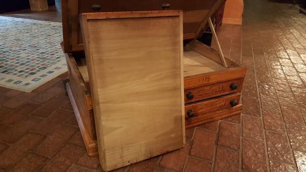 MEASUREMENTS and DETAILS: The pictures have an tape measure included so you can assess the measurements yourself. It is about 31" wide, approximately 12" tall, slanting down to a 11" tall 4-drawer front and 23" deep at the base.