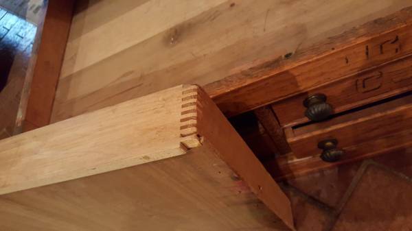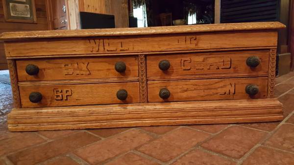 There are stenciled or hand-painted letters on the front, identifying the contents in each drawer from when it was set up in a store -- but those are slightly worn now, as seen in the pictures. All drawers are hand-made and dovetailed, with all original hardware and work great. The wood grain is just worn and lovely, a great old oaken patina.