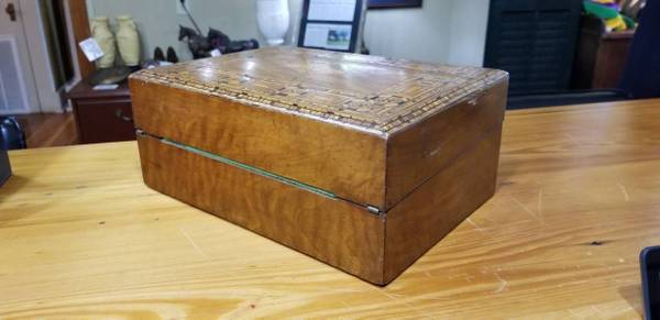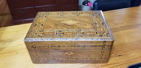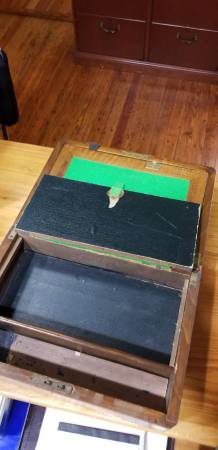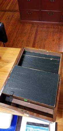 The photos are provided to demonstrate the condition of this rare English lapdesk -- especially the inlay and the fancy interior features. VERY cool -- AND marked down from $500 to sell!