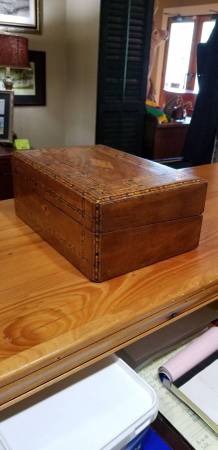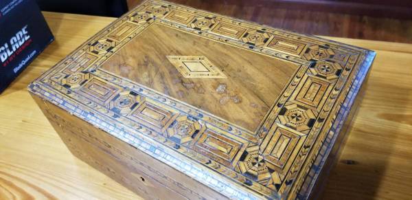 The piece has the marks of that service BUT is still absolutely SOLID IN EVERY RESPECT -- especially at this price. We have removed the contents, dusted it off inside and out but have not otherwise tried to clean it. Even now, the wood remains very attractive and the crafting is both eye-catching and distinctive. This is a unique and lovely piece from "back in the day." The lapdesk opens and closes beautifully -- the original hardware still working.