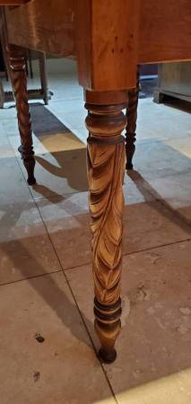 The table stands on 4 hand-carved legs decorated with a leaf motif -- these are not simply production-turned legs, as is often seen in this period, they are HAND-CARVED. So, this is an upgraded feature on a table like this. This design period ran from the 1st quarter through around the third quarter of the 19th century (1820-70). This table was probably made post-Civil War.