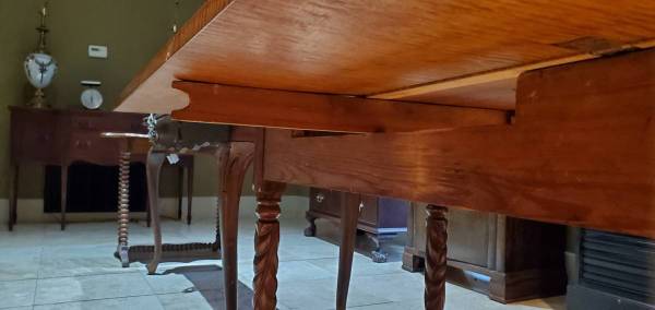 The table opens into a larger table, when needed -- and the batten mechanism for holding the table open are all hand-crafted and carved. It is all totally original and correct but no makers mark I can see.