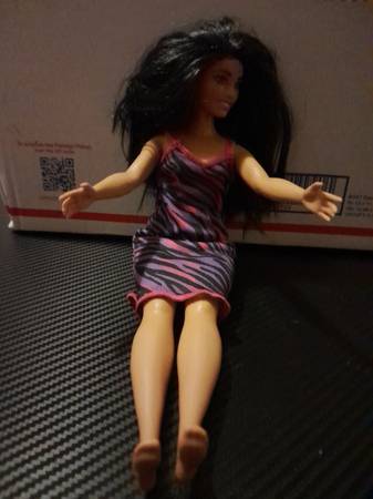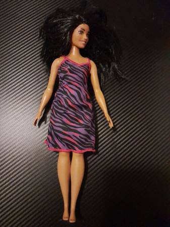 Posable doll ,dark complexion, black hair with pink,purple black dress