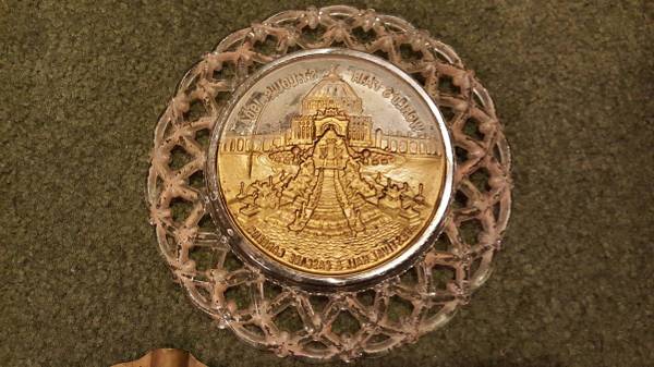 INSCRIPTIONS: See the pictures, but the little tray is a striking 2-tone brass thingamajig with the Palace of Manufacturing shown in relief on the inside of the tray. As noted earlier, the inscription on the reverse says PALACE OF MANUFACTURING THE WORLDS FAIR ST. LOUIS 1904
