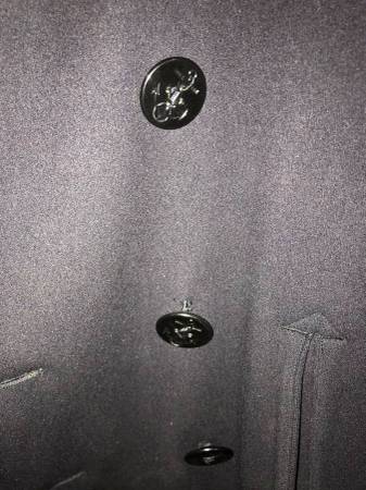 No damage whatsoever to the item, so it has kept well over the years. The pictures are complete and accurate, although the coat is a dark blue. The flash on the picture makes it look "grayer" than it actually is. All original with everything in place -- everything right. The photos are provided to demonstrate the A-1 condition of this coat. Everything is original, including every single button, which makes the entire coat original.