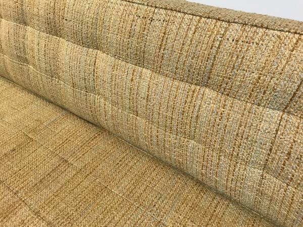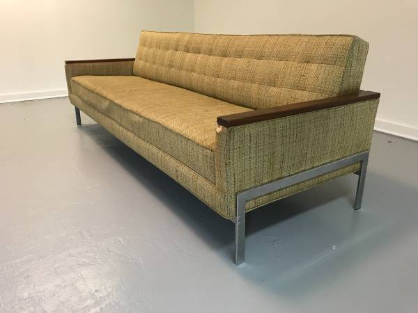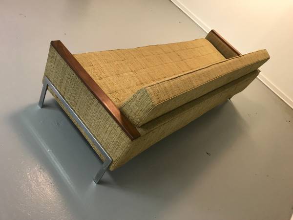 Chromium base with wood arms and original upholstery. Steel frame. Milo Baughman influence similar to Knoll, Herman Miller, Danish Vintage furniture of the era. Note similar couch shown with Selig...
