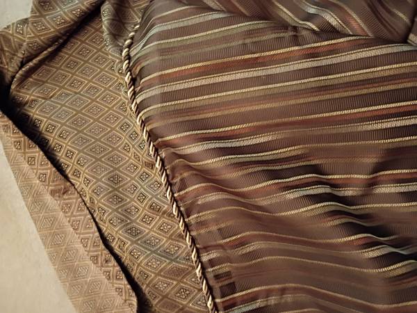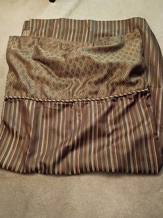 Dress up your bathroom with this attractive fabric shower curtain in very nice colors. It is machine washable.