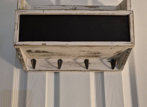 Wooden mail holder with Storage and 4 hooks for keys. Chalkboard to write cute messages!