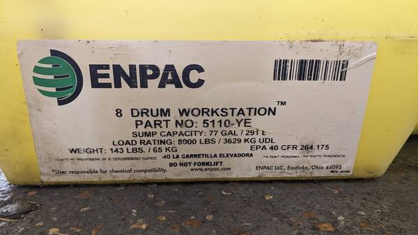 Selling one used Enpac 8 drum spill workstation pallet. Part number: 55110-YE. 96" L x 48" W x 6.5" H. Load Rating: 8000#. Sump capacity: 77 Gallon. We have 2 available. $200/ea. The sale of this...