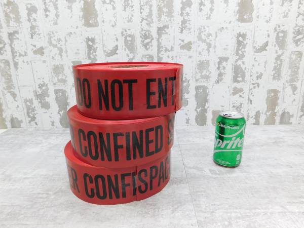 Selling three (3) new unused Barricade tape. 3" x 1000' rolls. "DANGER CONFINED SPACE DO NOT ENTER". The sale of this material is “as is,” without warranty or representation of any kind. pss6