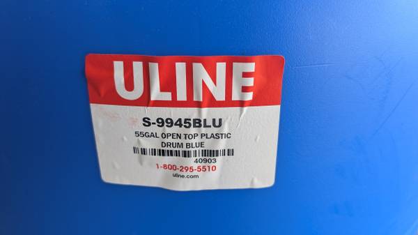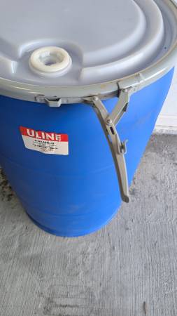 Selling one (1) new unused Uline Plastic Drum With Quick-Lock Lid. Part number: S-9945BLU.