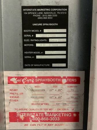 We are selling one used Unicure Paint Spray Booth. Cut-in Interstate Marketing. Model: UE-180PB. Inside measures 7'6" Deep x 11' 3" Wide x 10' High. Outside measures 10' Deep x 12' Wide x 12' High....